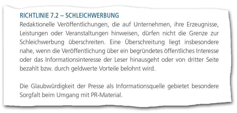 Der VDJ verweist Reisejournalisten zusätzlich auf den Pressekodex des Presserates und die darin verankerten Regeln für guten Journalismus. Doch unter dem Abschnitt über Trennung von Werbung und redaktionellem Inhalt finden sich Passagen, die für Reisejournalisten unangenehm werden könnten. So fällt laut dem Pressekodex Berichterstattung unter Schleichwerbung, die „von dritter Seite bezahlt bzw. durch geldwerte Vorteile belohnt wird.“ Außerdem müssen „bezahlte Veröffentlichungen so gestaltet sein, dass sie als Werbung für den Leser erkennbar sind.“